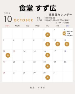 食堂 すず広、10月の営業カレンダーです。 10/4は人がいません(バイトさん)ワンオペにつき、予約制の人数制限での営業とさせていただきます。m(__)m9日~12日は、友人の結婚式と夏休みを兼ねましてお休みいたします。 […]